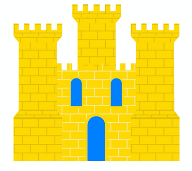 The universal interpretation for the castle is that it was sourced from the arms of the Kingdom of Castile. This is most probably correct, since the blazonry of Castile is also gold and azure (Gules a triple-towered castle Or masoned Sable and ajoure Azure). Therefore, even if the blazon was silent on the number of towers, three are usually drawn in homage to the traditional arms of Castile, which has three towers as well. Note that the door and windows are indicated as azure (“açul”).