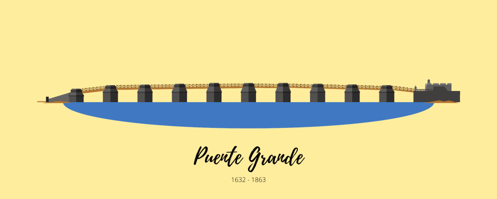Called the Puente Grande, the first bridge to span the Pasig River (at a time when the river was wider than what it is today) had ten spans consisting of nine stone piers and a road surface made of wooden beams. It also had a small fort or a fortin on the Parian side of the bridge, built as an additional defense for enemies trying to storm the bridge to attack Intramuros.
