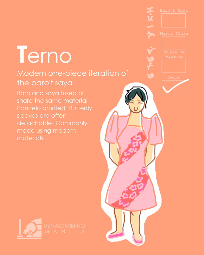 The terno has become a style of its own from being a description of a baro’t saya being of identical style and material. Although the term has been in use as early as in the Spanish period (terno meaning “matching” in Spanish), it has become the popularized term for the streamlined, one-piece incarnation of the baro’t saya we know today.