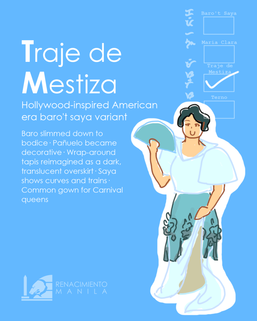 The traje de mestiza had become stylish in its heyday. Because the material used for the upper and lower apparel are similar, it is sometimes considered as “terno”. Putting emphasis on the hourglass figure and the shapely features of the ladies, it had become a staple for Manila Carnival candidates, aside from other Asian-inspired costumes.